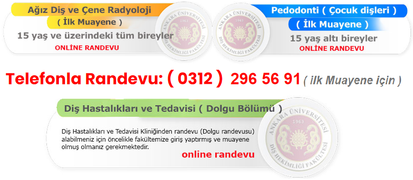 Ankara Üniversitesi Hekimliği Fakültesi Diş Hastanesine hasta muayene ve tedavileri, internetten ONLİNE randevu, Telefon ile ( 312 ) 296 56 91 nolu çağrı merkezi hattından veya Hastaneye şahsen başvurarak muayene randevusu alabilirsiniz.