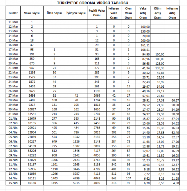 TÜRKİYE’DE CORONA VİRÜSÜ TABLOSU